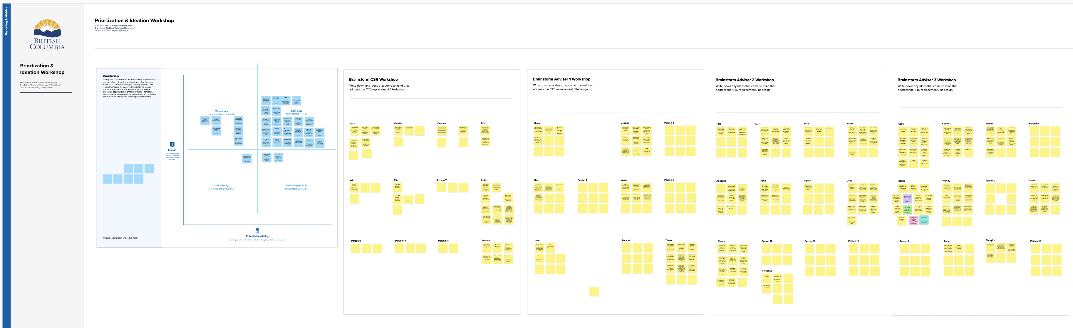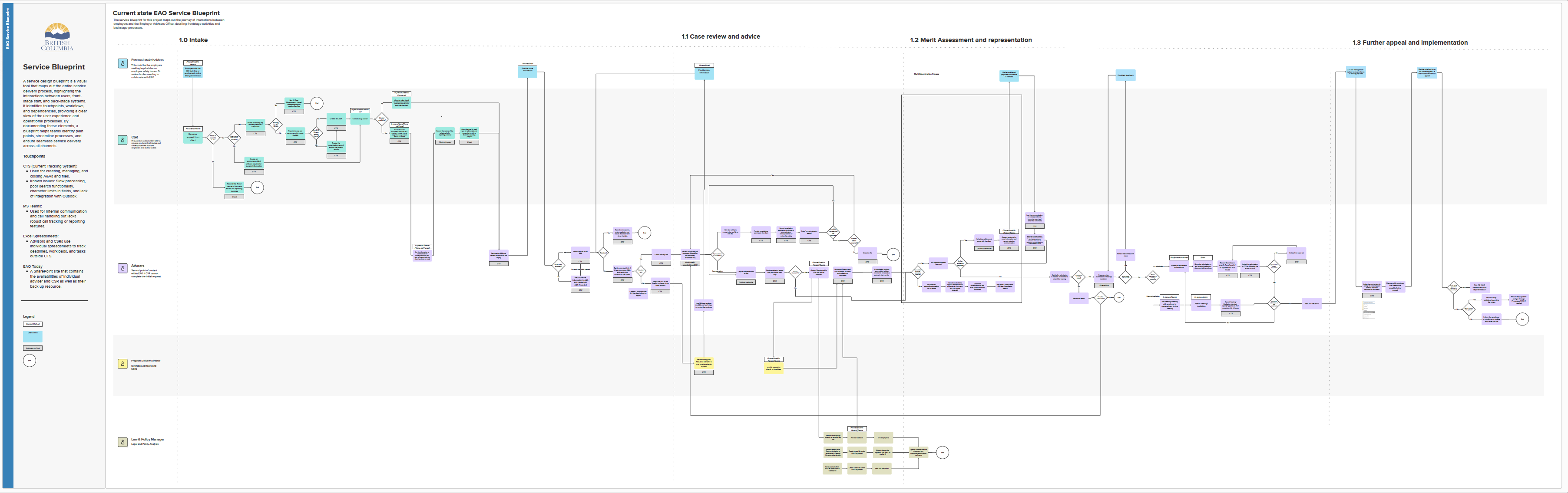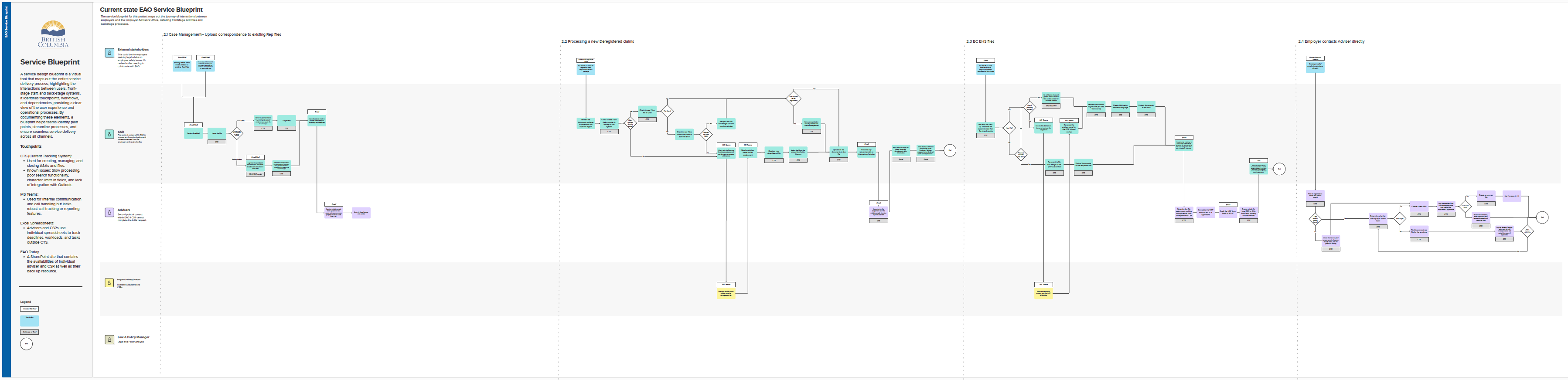 As part of the CTS redesign project, internal staff across multiple roles were interviewed to map the existing service blueprint and understand how key workflows operate in practice. The interviews focused on capturing the full service journey, including intake, case review and advice, merit assessment and representation, further appeal and implementation stages. Staff also shared detailed processes for ongoing case management, uploading correspondence to existing representation files, handling new or deregistered claims, and managing BC EHS files. Additionally, the team explored how employers often bypass intake channels to contact advisers directly, highlighting important variations and informal pathways within the current service delivery model.