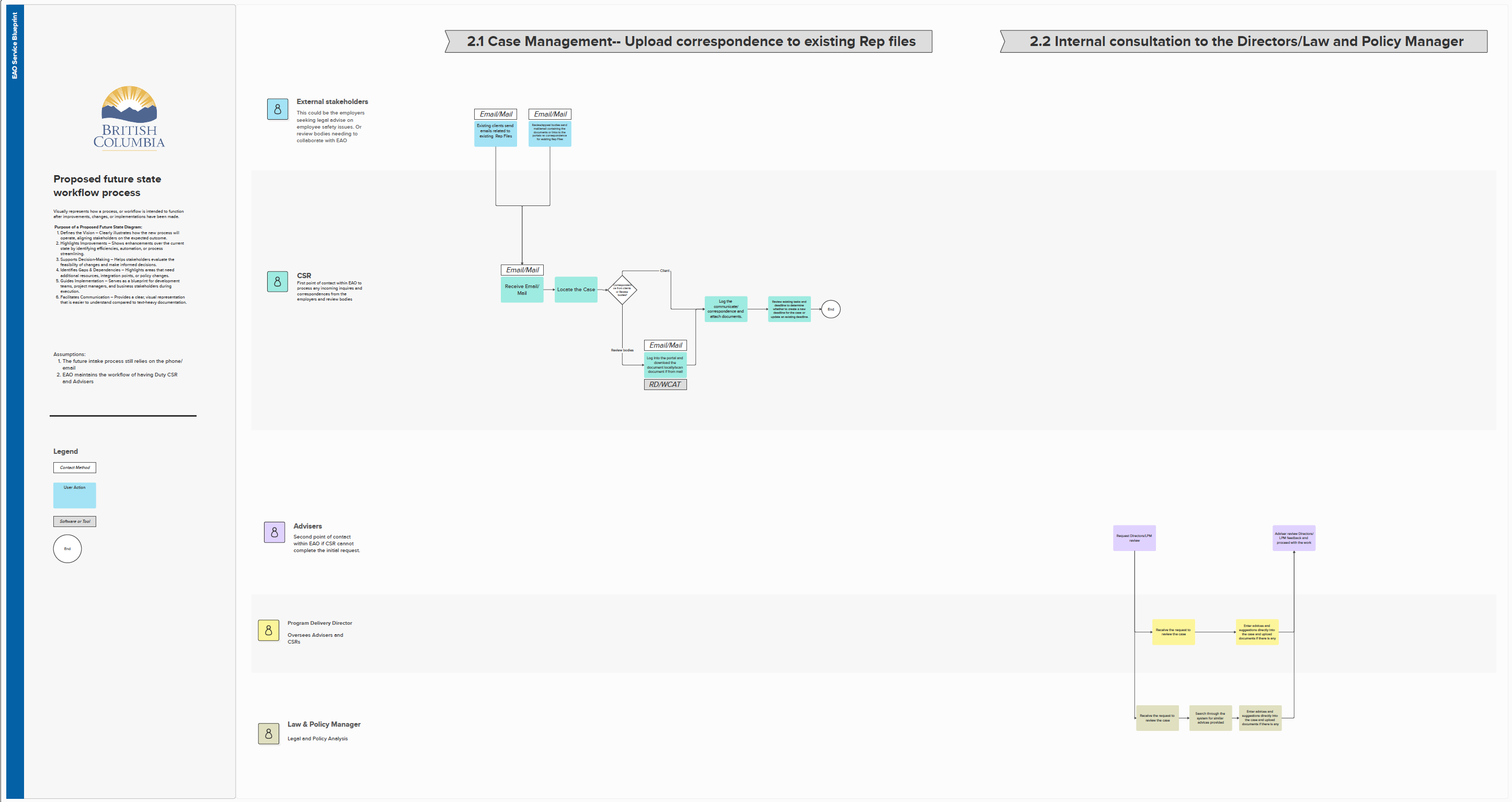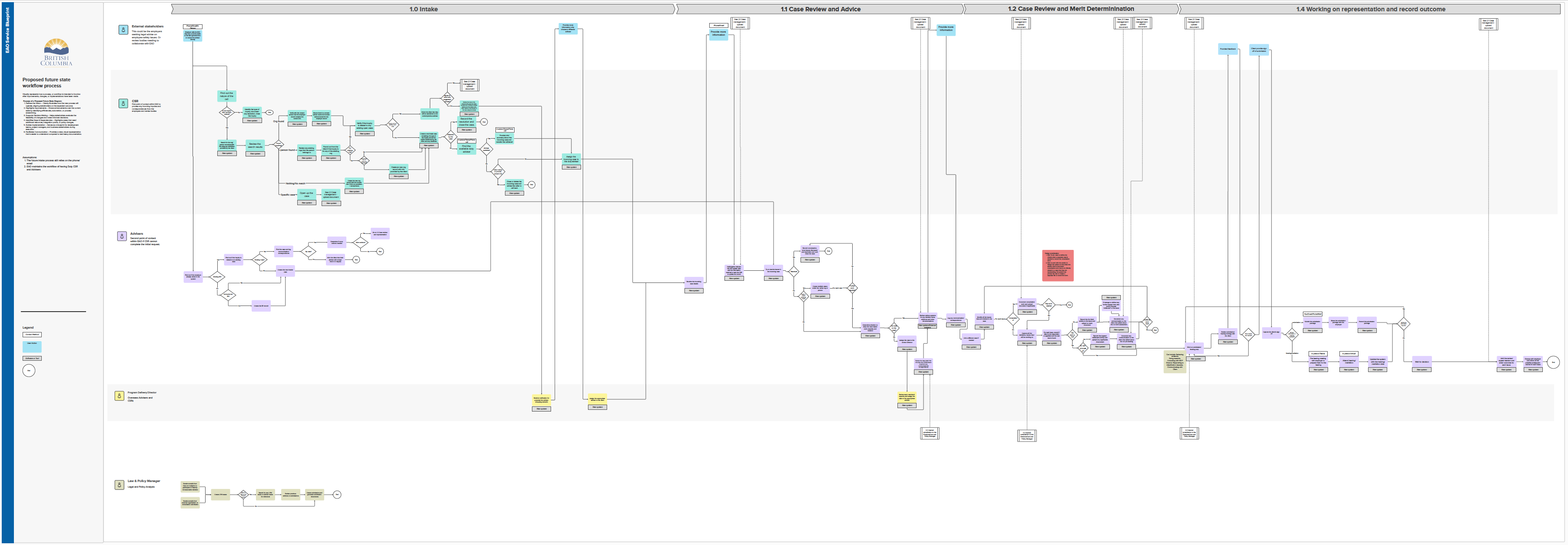 To envision the ideal future state of the service, several workshops were held with internal staff to collaboratively redesign and improve the service blueprint. These sessions built on the findings from user interviews and focused on streamlining workflows, reducing duplication, and clarifying roles. The final version of the future state blueprint included the following refined categories: Intake, Case Review and Advise, Case Review and Merit Determination, Working on Representation and Recording Outcomes, Uploading Correspondence, and Internal Consultation with Directors and the Law and Policy Manager. This co-designed blueprint reflects a more efficient, consistent, and user-informed approach to service delivery across the EAO.