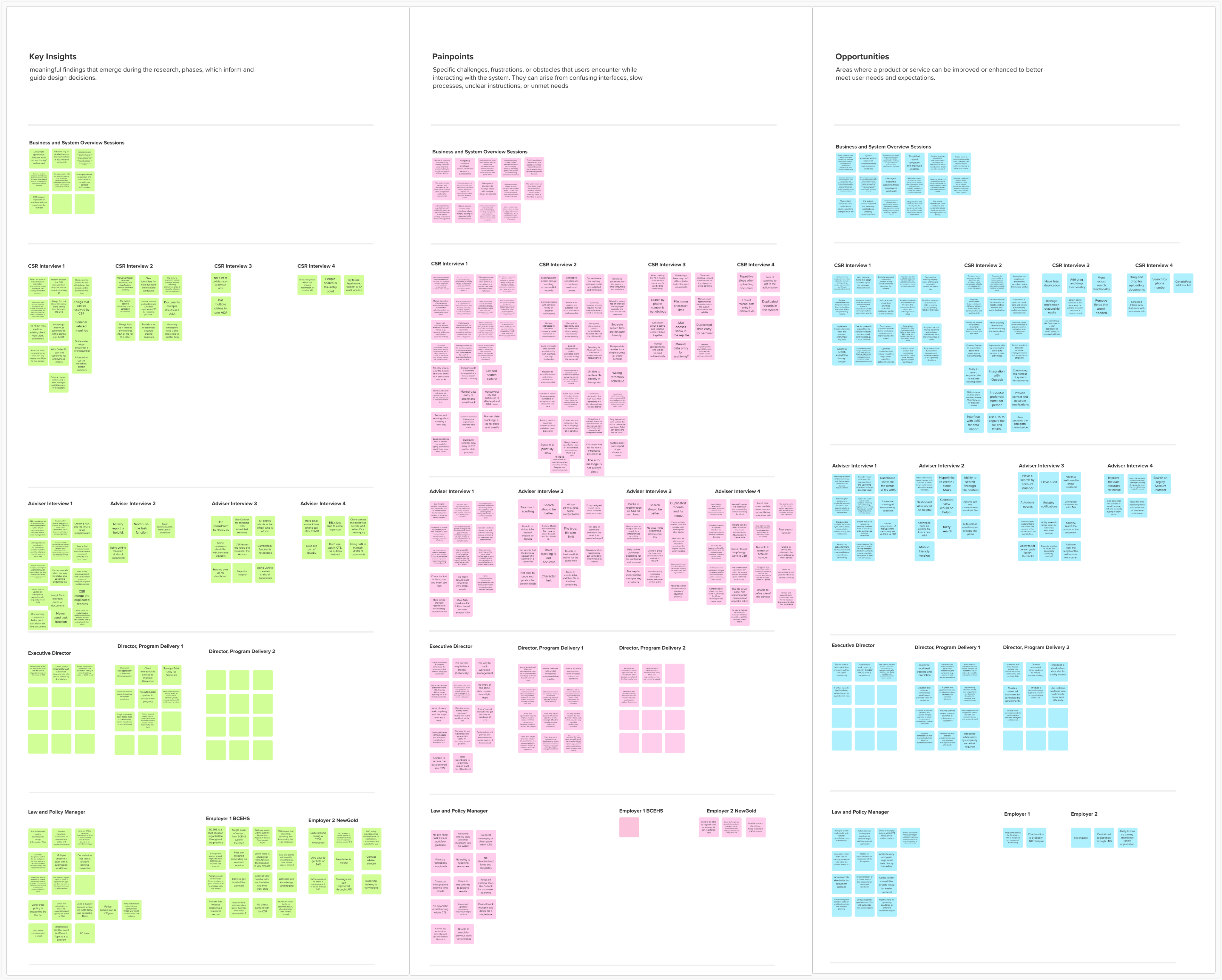As part of the user research phase, we conducted sixteen in-depth interviews with key CTS users, including advisers, CSRs, regional managers, employers, the system administrator, the law and policy manager, and the executive director. The goal was to understand workflows, identify pain points, and uncover opportunities for system improvements. We analyzed feedback by categorizing recurring themes such as system performance issues, data management inefficiencies, case tracking challenges, and workflow inconsistencies. By identifying common patterns, we prioritized high-impact enhancements to improve usability, efficiency, and client service delivery.