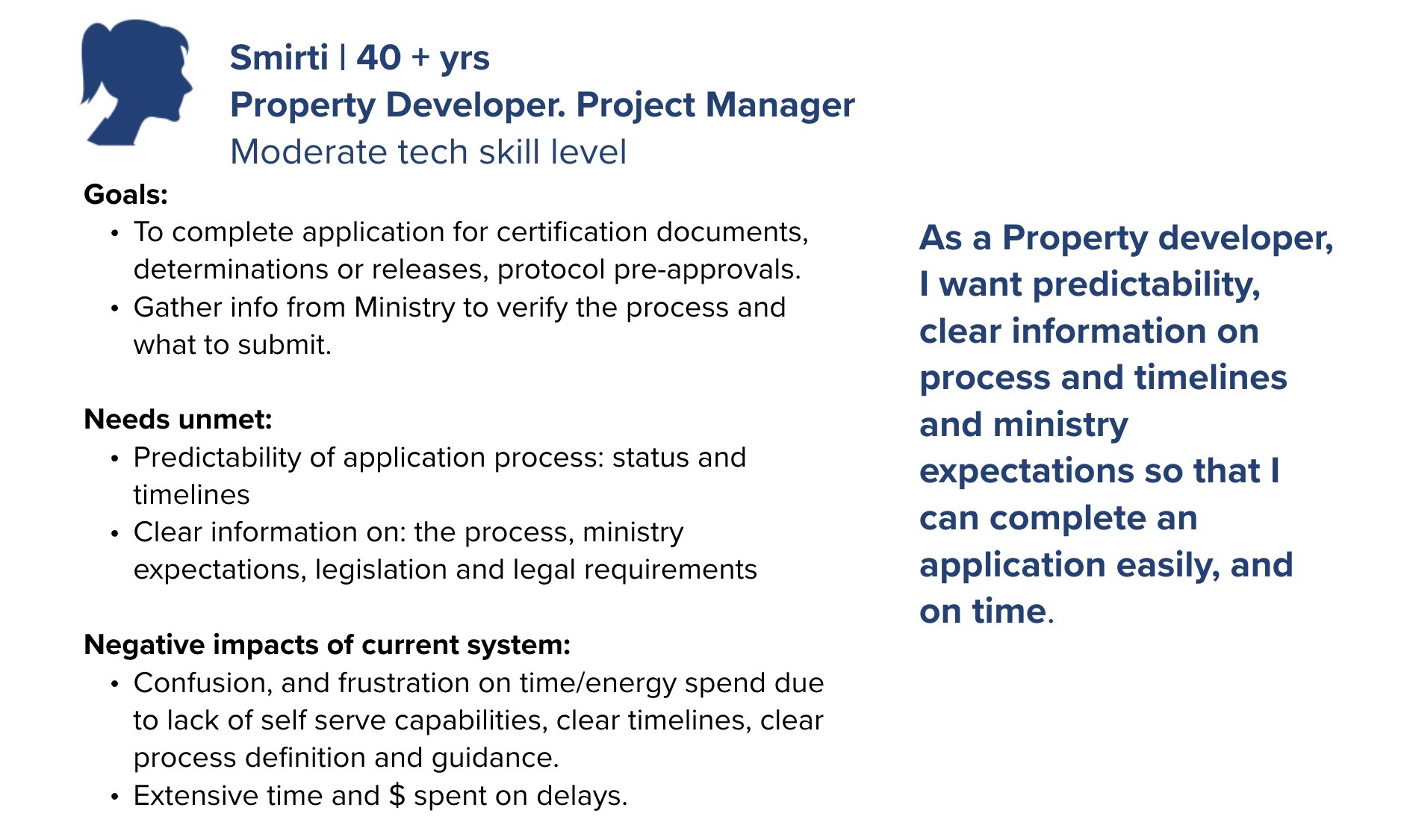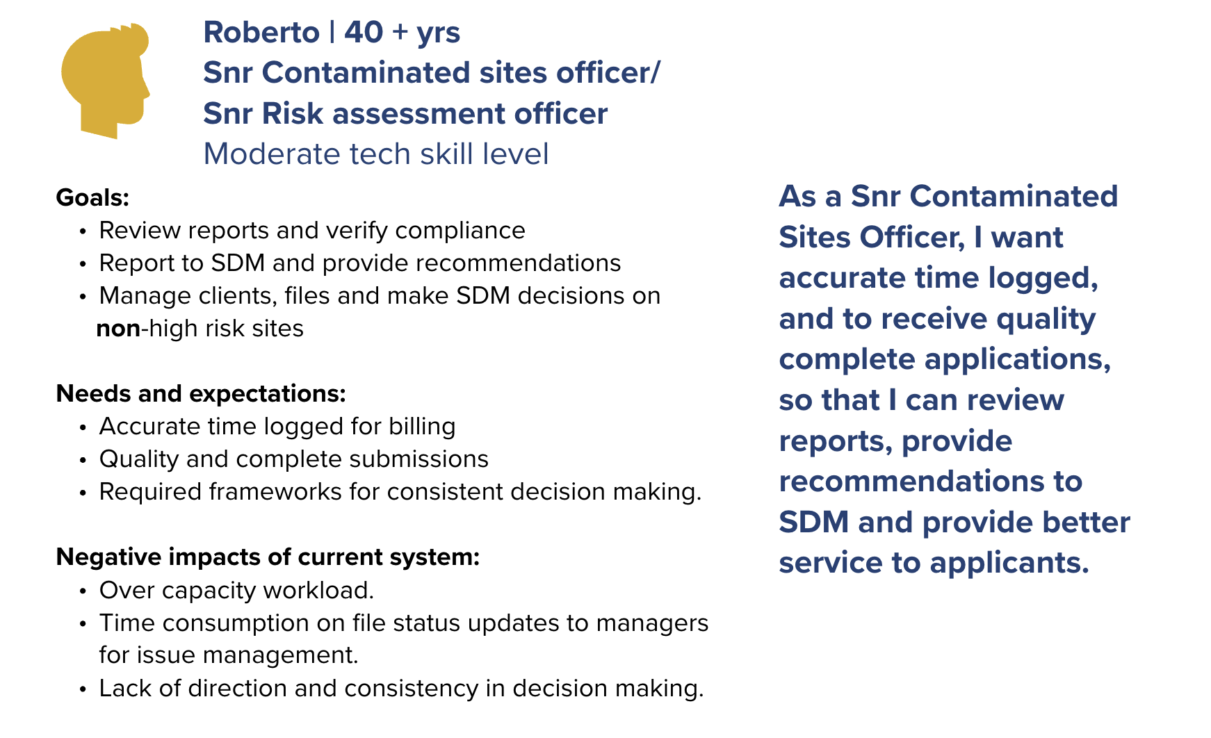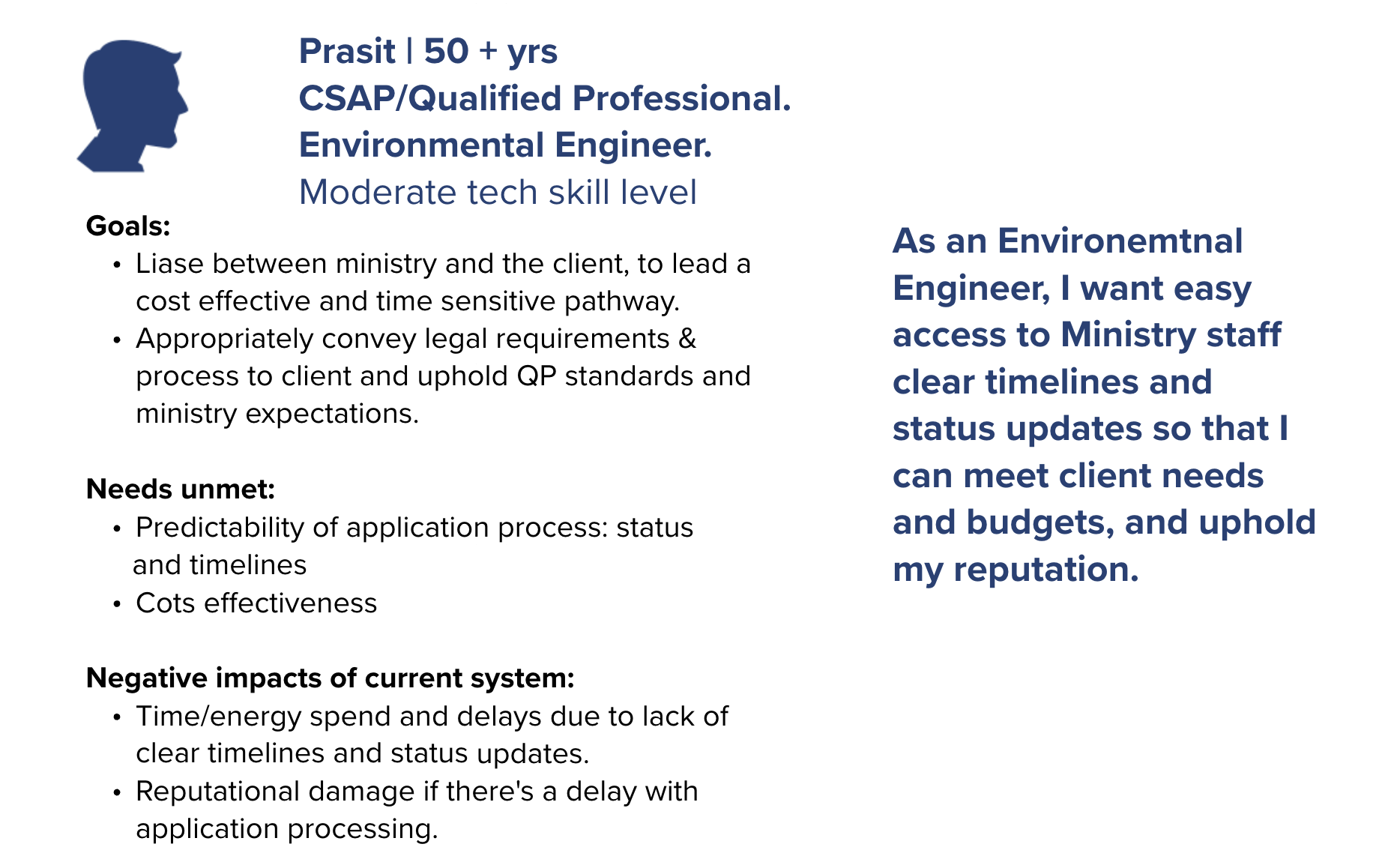 As part of the Site Remediation Services UX design project, personas were developed to represent the diverse external users involved in the application process for contaminated site services. Drawing from ten 45-minute virtual interviews with professionals across government, First Nations, environmental consulting firms, and private organizations, I synthesized insights into distinct user profiles. Participants included roles such as operations managers, environmental coordinators, senior planners, and compliance officers each with varying levels of experience navigating the Land Remediation Section (LRS) application process. These personas captured user goals, pain points, workflows, and contextual needs, providing a clear lens into the challenges applicants faced, such as confusion around form requirements and inefficient submission pathways. By grounding the design process in these research-backed personas, we ensured that future service improvements would be tailored to real user needs and aligned with the problem statement: helping applicants submit more successful applications while enabling staff to process them more efficiently.