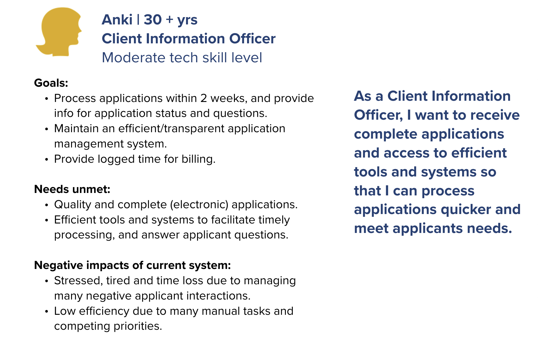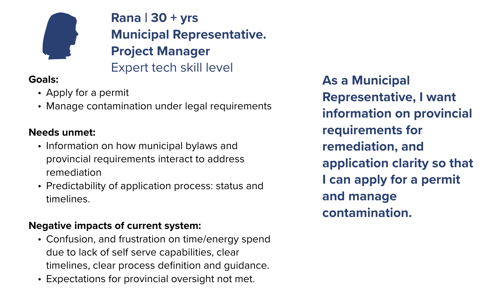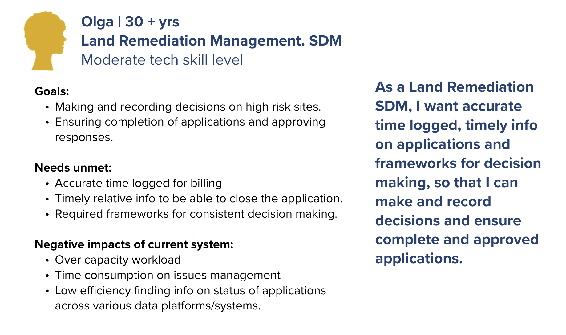 As part of the Site Remediation Services UX design project, personas were developed to represent the diverse external users involved in the application process for contaminated site services. Drawing from ten 45-minute virtual interviews with professionals across government, First Nations, environmental consulting firms, and private organizations, I synthesized insights into distinct user profiles. Participants included roles such as operations managers, environmental coordinators, senior planners, and compliance officers each with varying levels of experience navigating the Land Remediation Section (LRS) application process. These personas captured user goals, pain points, workflows, and contextual needs, providing a clear lens into the challenges applicants faced, such as confusion around form requirements and inefficient submission pathways. By grounding the design process in these research-backed personas, we ensured that future service improvements would be tailored to real user needs and aligned with the problem statement: helping applicants submit more successful applications while enabling staff to process them more efficiently.