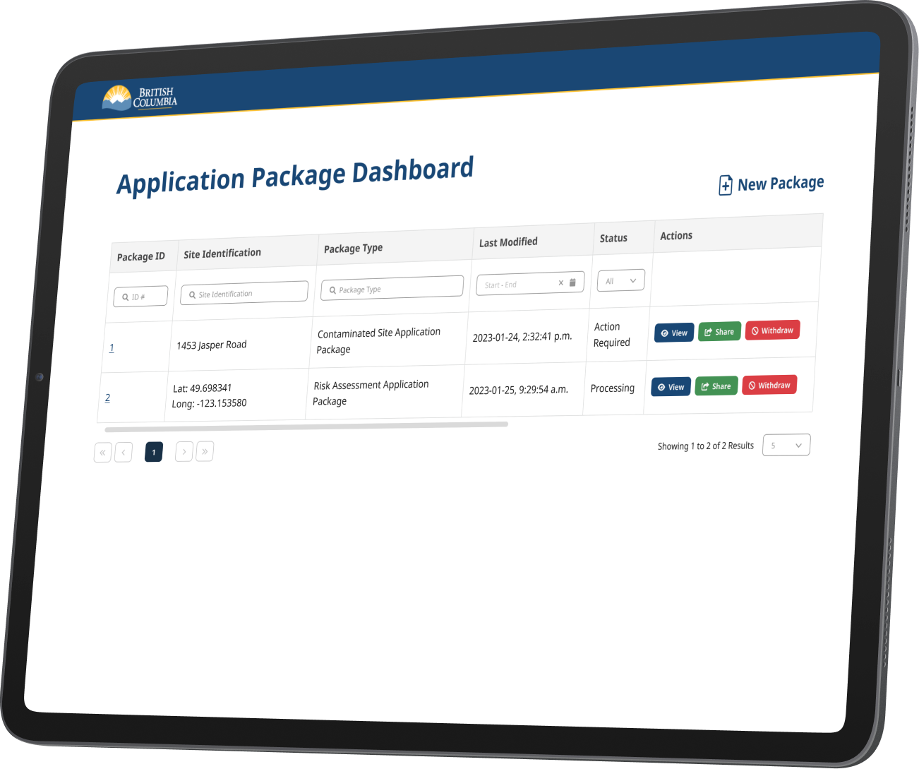The high-fidelity mockups for the Create Application Package and Application Package Dashboard offer a streamlined experience for external users. The package builder guides users through each step with real-time validation and contextual help. The dashboard displays all applications submitted, in progress, or drafts with clear status indicators, filter options, and quick actions, making it easy to manage and track submissions.