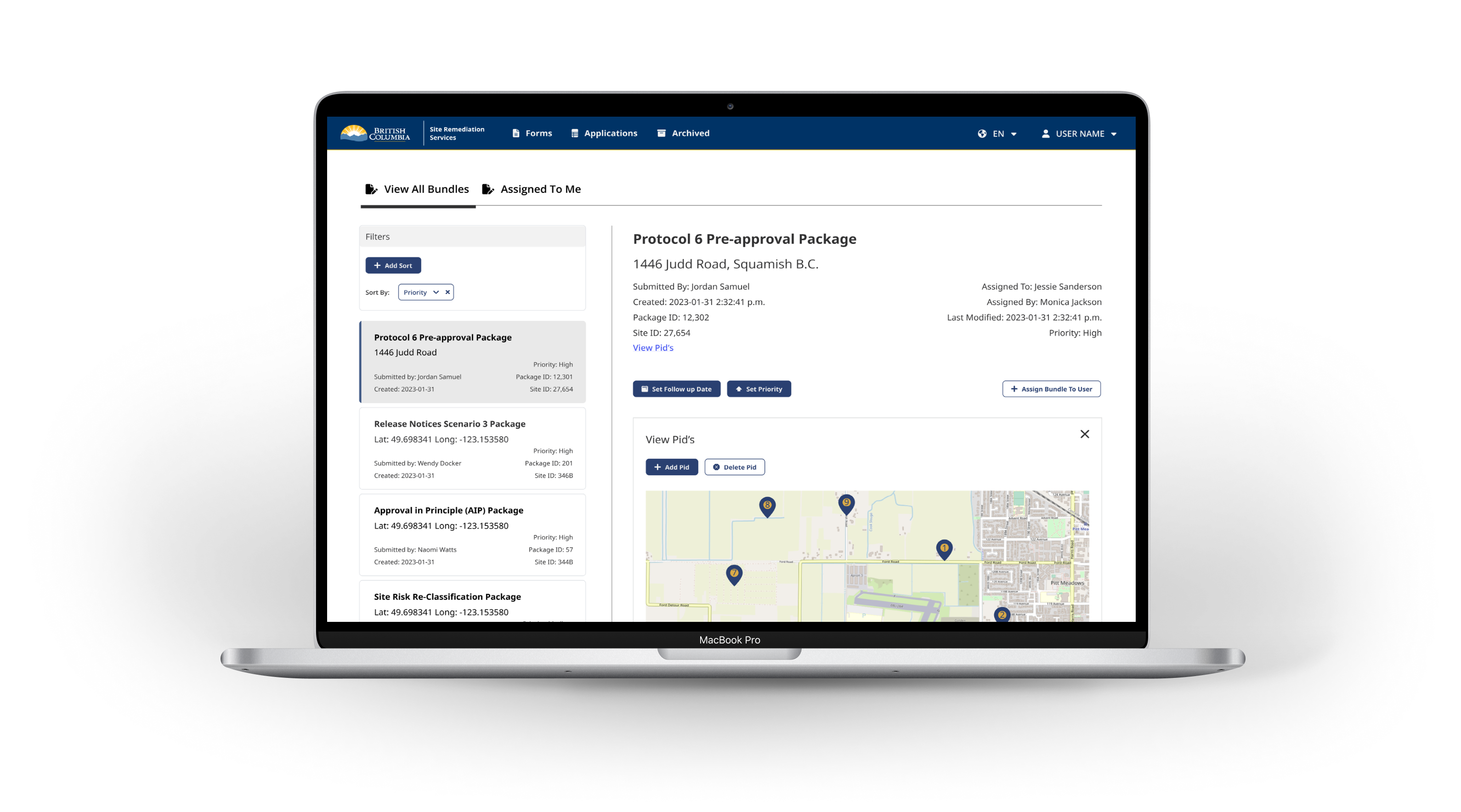 The high-fidelity pages for internal users feature an Application Dashboard optimized for clarity and operational efficiency. Each application includes real-time status indicators such as submitted, under review, or action required—helping staff quickly assess and prioritize workload. A built-in interactive map function displays location markers for each application, allowing users to visualize geographic distribution and zoom into specific areas for more detail. This spatial view is accessible directly from the dashboard and within each application record, supporting site verification and land-based decision-making without switching contexts.