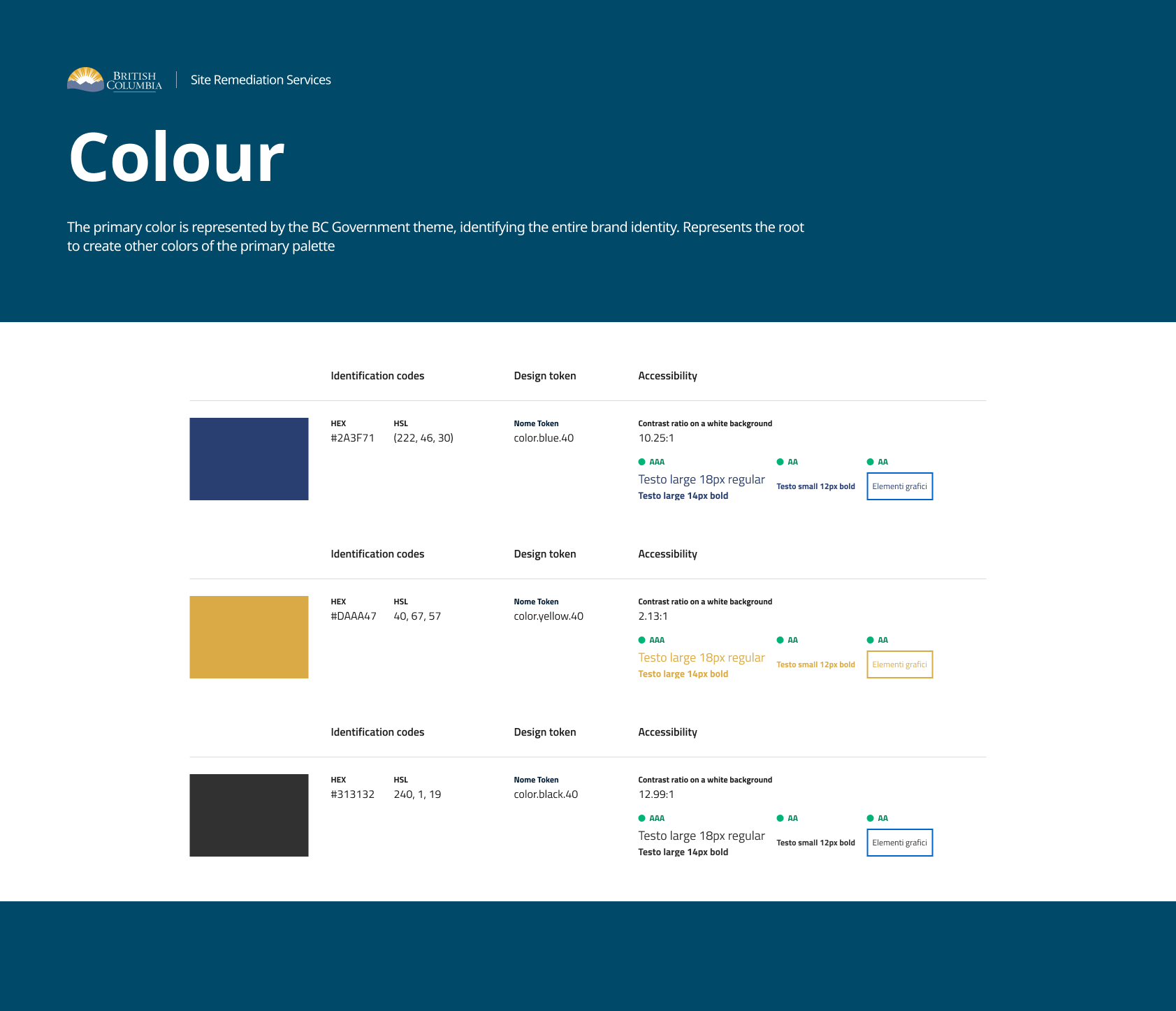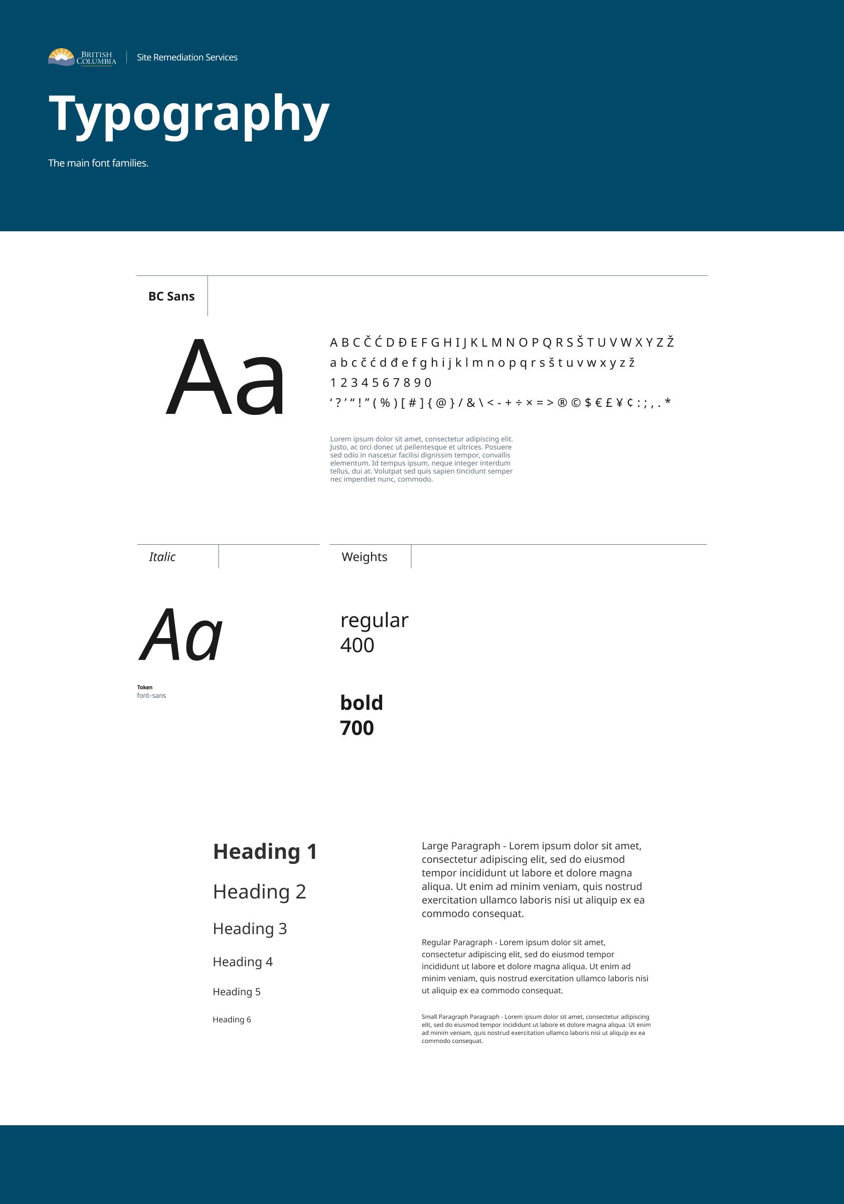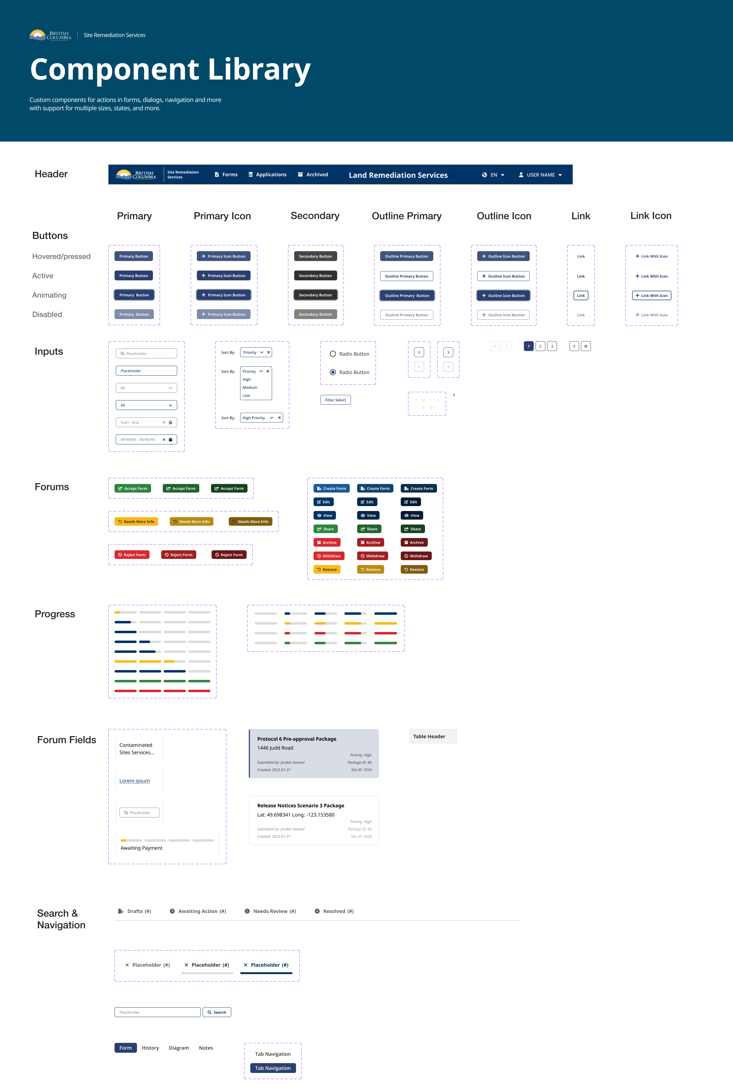 As part of the Site Remediation Services project, a component library and design system was developed to ensure consistency, accessibility, and efficiency across all interfaces. The system included foundational elements such as typography, color palette, navigation components, buttons, input fields, and progress bars. It incorporated selected components from the BC Gov Design System to maintain alignment with provincial standards, while also introducing custom components tailored to the unique needs of the application process, such as multi-step form elements and contextual alerts. The library was built in Figma to support rapid prototyping, collaboration, and handoff, and served as a centralized reference for both internal and external user interface design.